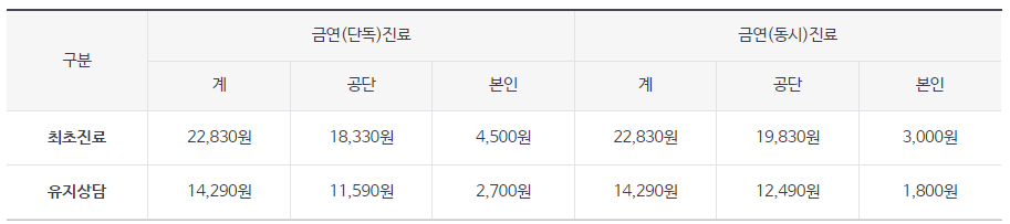 최초상담료와 금연유지상담료로 구분하고, 건강보험공단에서 80% 지원 (참여자 20% 부담)